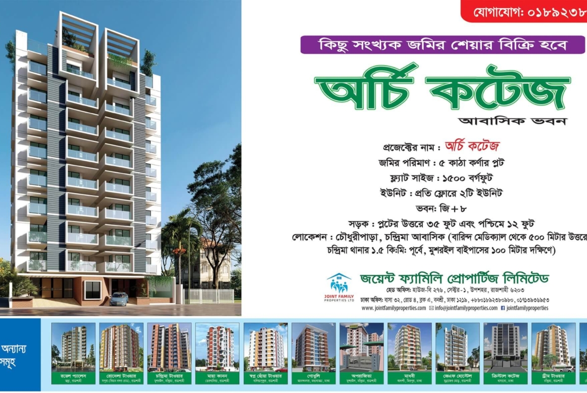 Joint Family Properties’ new project ‘Archie Cottage’. Residential building South Bridge is going to be constructed on south facing 5 khatar corner plot in Chowdhurypara with quiet environment in Rajshahi Chandrima residential area.